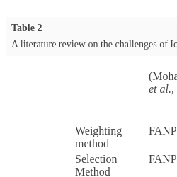 | Weighting method | FAHP | AHP | CRITIC | AHP | FAHP | AHP | – | – | AHP | – | AHP | AHP | FAHP | HFLTS | |