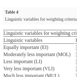 | Weighting method | FANP | – | – | – | – | – | – | – | – | – | – | – | – | |