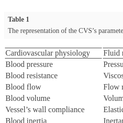 CVS is defined by principal physiological parameters including pressure, flow, resistance, volume, compliance, etc. These parameters shown in Table 1 are important for circulation of the blood throughout the body. When these parameters are examined, it is observed that they are used in similar ways in different engineering modelling scenarios such as fluid mechanics, electricity and computer science (Emek, 2018). We present the representations of the CVS in fluid mechanics (Westerhof et al., 2008; Fuchs, 2010), electrical analogue (Capoccia, 2015) and ABMS shown in Table 1, respectively.
