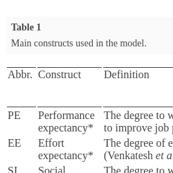 In order to study the acceptance of DLT in an emergency pandemic settings, we use all the constructs of the UTAUT model (Table