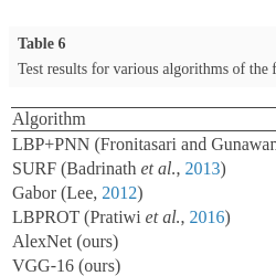 • Structure-based methods use line features and point features. This information is highly dependent on the selected coordinates and very sensitive to spatial occlusion; thus, the region of interest (ROI) must be carefully selected. Usually, when poorly performing images and feature points are used in feature extraction, difficulty in matching occurs. This method is also relatively sensitive to scaling, rotation, and displacement (Akinsowon and Alese,