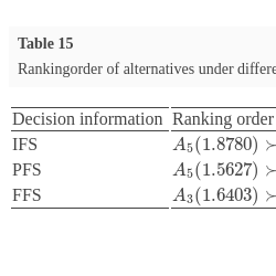 15, the dominance degree of the ranking first alternative using the FFS ELECTRE method is significantly higher than those obtained by IFS ELECTRE method and PFS ELECTRE method. Thus, the FFS ELECTRE method outperforms the IFS ELECTRE method and PFS method in discriminating the best alternative.