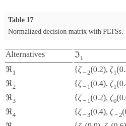 Step 3. Obtain the normalized decision matrix $\textit{NM}={({\textit{NPL}_{ij}}(\tilde{p}))_{m\times n}}$ with PLTSs, ${\textit{NPL}_{ij}}(\tilde{p})=\{{\zeta _{ij}^{(\gamma )}}({\tilde{p}_{ij}^{(\gamma )}})\big|\gamma =1,2,\dots ,\mathrm{\# }{L_{ij}}(\tilde{p}),{\textstyle\sum _{\gamma =1}^{\mathrm{\# }{L_{ij}}(\tilde{p})}}{\tilde{p}_{ij}^{(\gamma )}}=1\}$ $(i=1,2,\dots ,m,j=1,2,\dots ,n)$.