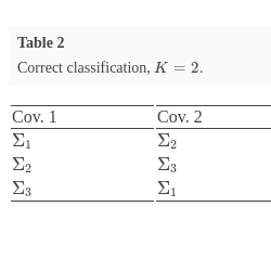 Table 2 shows the percentage of correctly classified events for several combinations of covariance matrices, where a total of $N=4000$ events were simulated from two mixtures (${N_{1}}=2500$, ${N_{2}}=1500$) for each combination. Events were classified with no probability thresholds, i.e. each event was assigned to the more likely component. We can conclude overall that the algorithm has a very good classification rate which, combined with the results for individual components, gives reason to expect accurate estimations for multiple components.