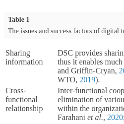 | Training and skills development | DSC requires providing employees with the necessary digital supply chain management skills to ensure an end-to-end understanding of value chain mechanics in digital transformation (Schrauf and Berttram, 2016; Xu, 2014; Luthra and Mangla, 2018; Gezgin et al., 2017). |