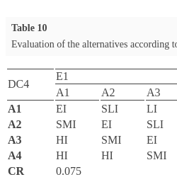 \[ \mathrm{Deff}({\tilde{\mathcal{F}}_{i}})=\left\{\begin{array}{l}\frac{1+|{({\mu _{i}^{L}})^{3}}-{({\nu _{i}^{L}})^{3}}|+1+|{({\mu _{i}^{U}})^{3}}-{({\nu _{i}^{U}})^{3}}|-{({\pi _{ij}^{L}})^{3}}-{({\pi _{ij}^{U}})^{3}}}{4}\times 10,\\ {} \hspace{1em}\textit{EI}\leqslant \textit{IVFFN}\leqslant \textit{CHI},\\ {} \frac{1}{\big(\frac{1+|{({\mu _{ij}^{{L^{\phantom{M}}}}})^{3}}-{({\nu _{ij}^{L}})^{3}}|+1+|{({\mu _{ij}^{U}})^{3}}-{({\nu _{ij}^{U}})^{3}}|-{({\pi _{ij}^{L}})^{3}}-{({\pi _{ij}^{U}})^{3}}}{4}\times 10\big)},\\ {} \hspace{1em}\textit{SLI}\leqslant \textit{IVFFN}\leqslant \textit{CLI}.\end{array}\right.\]4 A Novel Fermatean Fuzzy Analytic Hierarchy Process Method