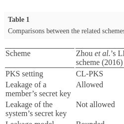 | Leakage of a member’s secret key | Allowed | Allowed | Allowed | Allowed |