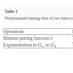 | Bilinear pairing function $\hat{e}$ | ${T_{bpf}}$ | ≈20 ms | ≈96 ms |