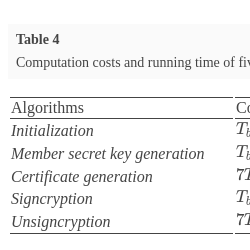 Here, let’s evaluate the computation time of our FCLR-CBSC scheme in terms of Initialization, Member secret key generation, Certificate generation, Signcryption and Unsigncryption algorithms. By the simulation results in Xiong and Qin (2015), the notations (i.e. ${T_{bpf}}$ and ${T_{exp}}$) for two time-consuming computations and their running time are presented in Table 3. Additionally, the running time of the multiplication in ${G_{1}}$ or ${G_{2}}$ is negligible since it is more slighter than ${T_{bpf}}$ and ${T_{exp}}$. The simulation results in Xiong and Qin (2015) are evaluated under a PC with an Intel 1.80-GHz i7 CPU and a mobile device with an Intel 624-MHz PXA270 CPU. Meanwhile, the order p of both ${G_{1}}$ and ${G_{2}}$ is a 512-bit prime security level. The computation costs and the running time of five algorithms in our FCLR-CBSC scheme are listed in Table 4. By Table 4, it is obvious that our scheme performs efficiently on both a PC and a mobile device.