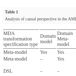 2021). The papers that do not have MDA transformations specified are not included. The last line in italic indicates a gap in the established MDD/MDA transformation approaches where the MDD/MDA methods are converging to a causal knowledge based transformation rules. “DSL” stands for “Domain specific language”. Three types of knowledge are shown in Table