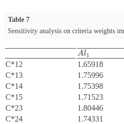 In this section, sensitivity analysis and comparative analysis were performed in order to get proper outcomes. The purpose of sensitivity analysis is to change every indicator’s weight with another indicator’s weight; therefore, 10 various computations are developed. This part seeks to find C* values for each consideration, and several names are given for each calculation. For example, C13 means criterion 1’s and criterion 3’s weights have been exchanged and C45 means criterion 4’s and criterion 5’s weights have been exchanged. Fig.