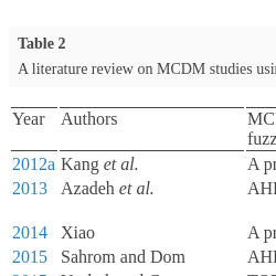 | 2018 | Kutlu Gündoğdu et al. | Hesitant fuzzy EDAS | Hospital selection |