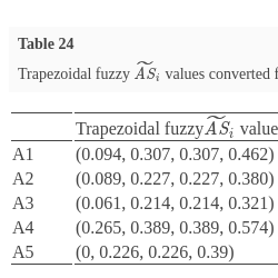 | Trapezoidal fuzzy${\widetilde{\textit{AS}}_{i}}$ values of alternatives | |