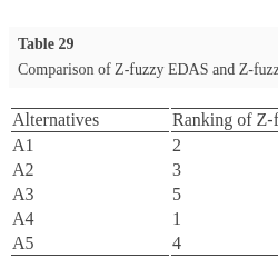 | Alternatives | Ranking of Z-fuzzy EDAS | Ranking of Z-fuzzy TOPSIS |