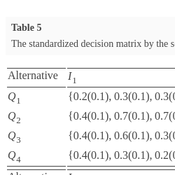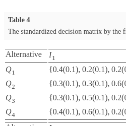 | ${Q_{1}}$ | $\{0.4(0.5),0.3(0.2),0.6(0.3)\}$ | $\{0.3(0.8),0.5(0.2)\}$ | $\{0.6(0.3),0.2(0.7)\}$ | $\{0.4(0.2),0.8(0.1),0.3(0.7)$} |