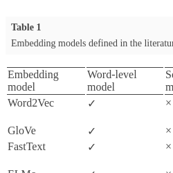 Embedding model Word-level model Sentence/document level model Contextualized embeddings Architecture
