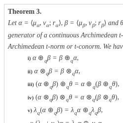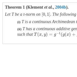 • (ii) T has a continuous additive generator, i.e. there is a continuous, strictly decreasing function $g:[0,1]\to [0,\infty ]$ with $t(1)=0$ such that $T(x,y)={g^{-1}}(g(x)+g(y))$ for all $(x,y)\in [0,1]\times [0,1]$.