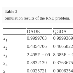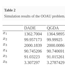 \[\begin{aligned}{}& f(\bar{x})=35{x_{1}^{0.6}}+35{x_{2}^{0.6}},\\ {} & {h_{1}}(\bar{x})=200{x_{1}}{x_{4}}-{x_{3}}=0,\\ {} & {h_{2}}(\bar{x})=200{x_{2}}{x_{6}}-{x_{5}}=0,\\ {} & {h_{3}}(\bar{x})={x_{3}}-10000({x_{7}}-100)=0,\\ {} & {h_{4}}(\bar{x})={x_{5}}-10000(300-{x_{7}})=0,\\ {} & {h_{5}}(\bar{x})={x_{3}}-10000(600-{x_{8}})=0,\\ {} & {h_{6}}(\bar{x})={x_{5}}-10000(900-{x_{9}})=0,\\ {} & {h_{7}}(\bar{x})={x_{4}}\ln ({x_{8}}-100)-{x_{4}}\ln (600-{x_{7}})-{x_{8}}+{x_{7}}+500=0,\\ {} & {h_{8}}(\bar{x})={x_{6}}\ln ({x_{9}}-{x_{7}})-{x_{6}}\ln (600)-{x_{9}}+{x_{7}}+600=0,\\ {} & 0\leqslant {x_{1}}\leqslant 10,\hspace{1em}0\leqslant {x_{2}}\leqslant 200,\hspace{1em}0\leqslant {x_{3}}\leqslant 100,\hspace{1em}0\leqslant {x_{4}}\leqslant 200,\\ {} & 1000\leqslant {x_{5}}\leqslant 2000000,\hspace{1em}0\leqslant {x_{6}}\leqslant 600,\hspace{1em}100\leqslant {x_{7}}\leqslant 600,\hspace{1em}100\leqslant {x_{8}}\leqslant 600,\\ {} & 100\leqslant {x_{9}}\leqslant 900.\end{aligned}\]Table 1