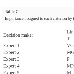 | Expert 5 | M | VG | G | $(3,5,5)$ | $(7,7,9)$ | $(5,7,7)$ |