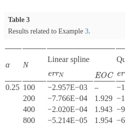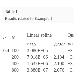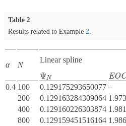 \[\begin{aligned}{}\textit{Err}& \leqslant \frac{1}{2}{M_{2}}\bigg({(\Delta x)^{2+\alpha }}\bigg({C_{2}}(\alpha )+\frac{1}{6\hspace{0.2778em}\Gamma (1+\alpha )}{\bigg(\frac{b-a}{\Delta x}\bigg)^{\alpha }}\bigg)\bigg)\\ {} & ={M_{2}}\bigg(\frac{{C_{2}}(\alpha )}{2}{(\Delta x)^{2+\alpha }}+\frac{{(b-a)^{\alpha }}}{12\hspace{0.2778em}\Gamma (1+\alpha )}{(\Delta x)^{2}}\bigg)\\ {} & ={M_{2}}\frac{{(b-a)^{\alpha }}}{12\hspace{0.2778em}\Gamma (1+\alpha )}{(\Delta x)^{2}}+\mathrm{O}\big({(\Delta x)^{2+\alpha }}\big).\end{aligned}\]2.3.2 The Case of the Quadratic Spline