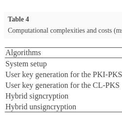 | User key generation for the PKI-PKS | ${T_{bil}}+3{T_{mul}}$ | 186 ms | 38 ms |