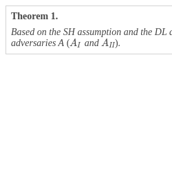 – Secure hash function (SH) assumption: Let $\textit{SH}:{\{0,1\}^{\ast }}\to {\{0,1\}^{t}}$ be a secure hash function, where t is a fixed length. Then it is hard to discover any two random bit strings ${\textit{RBS}_{1}}$ and ${\textit{RBS}_{2}}$ such that $\textit{SH}({\textit{RBS}_{1}})=\textit{SH}({\textit{RBS}_{2}})$.