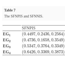 \[\begin{aligned}{}& \textit{SV}({\textit{SFNPIS}_{j}})=\underset{i}{\max }\textit{SV}({\textit{NET}_{ij}},{\textit{NEI}_{ij}},{\textit{NEF}_{ij}}),\end{aligned}\]