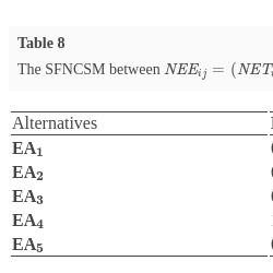 \[\begin{aligned}{}& \textit{SFNCSM}(\textit{EA},\textit{EB})\\ {} & =\frac{1}{2}\left(\begin{array}{l}\cos \bigg[\frac{\pi }{6}\big(\big|{\textit{ET}_{A}^{2}}-{\textit{ET}_{B}^{2}}\big|+\big|{\textit{EI}_{A}^{2}}-{\textit{EI}_{B}^{2}}\big|+\big|{\textit{EF}_{A}^{2}}-{\textit{EF}_{B}^{2}}\big|\big)\bigg]\\ {} \hspace{1em}+\cos \bigg[\frac{\pi }{2}\max \big(\big|{\textit{ET}_{A}^{2}}-{\textit{ET}_{B}^{2}}\big|,\big|{\textit{EI}_{A}^{2}}-{\textit{EI}_{B}^{2}}\big|,|{\textit{WF}_{A}}-{\textit{WF}_{B}}|\big)\bigg]\end{array}\right),\\ {} & \textit{SFNCSM}(\textit{EA},\textit{EB})\in [0,1].\end{aligned}\]