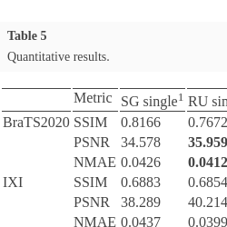 5 reveals that model RU single yields the best results in 2 metrics on the BraTS2020 dataset with PSNR = 35.959 and NMAE = 0.0412, followed by the second-best performance from the proposed model. However, because RU single is trained solely on the BraTS2020 dataset, which contains both healthy normal brain MRI images and brains with tumours or abnormalities, instead of being trained on both BraTS2020 and IXI datasets, it’s plausible that it may achieve superior performance compared to a model trained on both datasets. This is because the IXI dataset only consists of healthy normal brain MRI images. Upon close examination, the difference between the top-performing outcome and the second-best outcome is minimal. Additionally, the proposed model exhibited the best performance across all three metrics on the IXI dataset. This underscores the model’s robustness and its capability to adapt effectively when trained on diverse datasets.