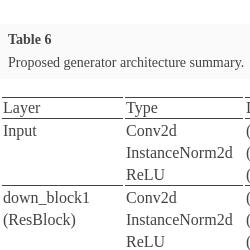 • Instance Normalization: Instance normalization is applied to the generator. It normalizes the activations within each instance (sample) in the batch, making the network more robust to variations in instance statistics. By applying instance normalization, the generator can effectively capture and preserve the style and texture information of the input image during the translation process.
