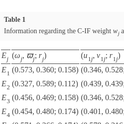 In Step I.4, the C-IF evaluation value ${c_{kj}}$, expressed as a C-IF number (${u_{kj}},{v_{kj}};{r_{kj}}$), was derived from the aggregated evaluation data in Otay and Kahraman’s (2022) study and is shown in the third to fifth columns of Table 1. The C-IF characteristic for each ${O_{k}}$ was established using Eqs. (12) and (13) as follows: ${C_{k}}=\{\langle {E_{j}},{u_{kj}},{v_{kj}};{r_{kj}}\rangle |{E_{j}}\in \{{E_{1}},{E_{2}},\dots ,{E_{9}}\}\}=\{\langle {E_{j}},{\mathfrak{O}_{r}}({u_{kj}},{v_{kj}})\rangle |{E_{j}}\in \{{E_{1}},{E_{2}},\dots ,{E_{9}}\}\}$, where ${\mathfrak{O}_{r}}({u_{kj}},{v_{kj}})=\{\langle \ell ,{\ell ^{\prime }}\rangle \mid \ell ,{\ell ^{\prime }}\in [0,1],{[{({u_{kj}}-\ell )^{2}}+{({v_{kj}}-{\ell ^{\prime }})^{2}}]^{0.5}}\leqslant {r_{kj}},\hspace{2.5pt}\text{and}\hspace{2.5pt}\ell +{\ell ^{\prime }}\leqslant 1\}$ for $k\in \{1,2,3\}$ and $j\in \{1,2,\dots ,9\}$.