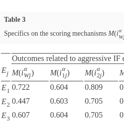 The results, including the scoring mechanisms $M({i_{Wj}^{\alpha }})$ and $M({i_{kj}^{\alpha }})$ for aggressive IF estimates (left part), and $M({i_{Wj}^{\beta }})$ and $M({i_{kj}^{\beta }})$ for cautious IF estimates (right part), are illustrated in Table 3.Table 3