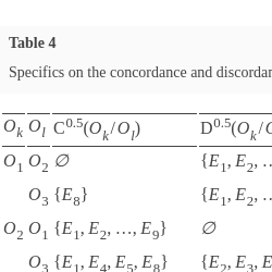 As outlined in Step I.8, Table 4 presents the results for ${\mathbb{C}^{0.5}}({O_{k}}/{O_{l}})$ and ${\mathbb{D}^{0.5}}({O_{k}}/{O_{l}})$ when option ${O_{k}}$ outperforms ${O_{l}}$ ($k\ne l$), along with relevant explanations.