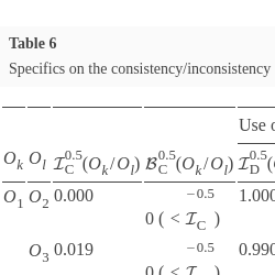 Using the C-IF Euclidean-like distance ${D_{\mathfrak{M}}^{2}}({c_{kj}},{c_{lj}})$, the inconsistency indicator ${\mathcal{I}_{\mathbb{D}}^{0.5}}({O_{3}}/{O_{2}})$ equals 0.454. Additional results are provided in Table 6’s third, fifth, and seventh columns.Table 6