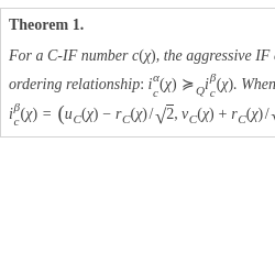 For a C-IF number $c(\chi )$, the aggressive IF estimate ${i_{c}^{\alpha }}(\chi )=({u_{I}^{\alpha }}(\chi ),{v_{I}^{\alpha }}(\chi ))$ and cautious IF estimate ${i_{c}^{\beta }}(\chi )=({u_{I}^{\beta }}(\chi ),{v_{I}^{\beta }}(\chi ))$ follow a quasi-ordering relationship: ${i_{c}^{\alpha }}(\chi ){\succcurlyeq _{Q}}{i_{c}^{\beta }}(\chi )$. When defined as ${i_{c}^{\alpha }}(\chi )=\big({u_{C}}(\chi )+{r_{C}}(\chi )/\sqrt{2},{v_{C}}(\chi )-{r_{C}}(\chi )/\sqrt{2}\big)$ and ${i_{c}^{\beta }}(\chi )=\big({u_{C}}(\chi )-{r_{C}}(\chi )/\sqrt{2},{v_{C}}(\chi )+{r_{C}}(\chi )/\sqrt{2}\big)$, both estimates exhibit equal hesitancy: ${h_{I}^{\alpha }}(\chi )={h_{I}^{\beta }}(\chi )$.