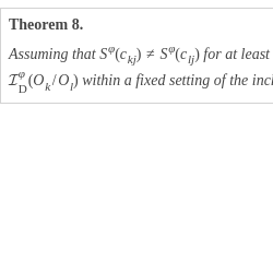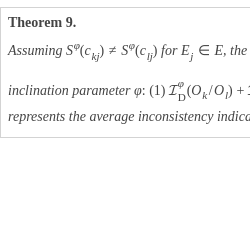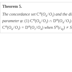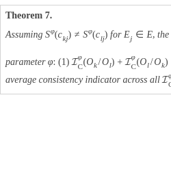 \[ {\mathcal{I}_{\mathbb{C}}^{\varphi }}({O_{k}}/{O_{l}})=\frac{{\textstyle\sum _{{E_{j}}\in {\mathbb{C}^{\varphi }}({O_{k}}/{O_{l}})}}{S^{\varphi }}({w_{j}})\cdot |{S^{\varphi }}({c_{kj}})-{S^{\varphi }}({c_{lj}})|}{{\textstyle\textstyle\sum _{{j^{\prime }}=1}^{n}}{S^{\varphi }}({w_{{j^{\prime }}}})\cdot |{S^{\varphi }}({c_{k{j^{\prime }}}})-{S^{\varphi }}({c_{l{j^{\prime }}}})|}.\]Theorem 6.