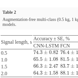 CB tension signal data was applied to train various ML and DL models by Žvirblis et al. (2022) to determine the minimum signal length while maintaining high classification accuracy. However, in the study, DL models were only applied to classify two CB states (loaded with a 2 kg weight and unloaded). The authors did not include the detection of CB damage. Also, in the study, the initial dataset of CB tension signals was insufficient to train the models, so the authors performed two data augmentations methods like addition of random Laplace noise and drifted Gaussian noise. However, the main aim of the above-mentioned study was to develop high-accuracy classification models.