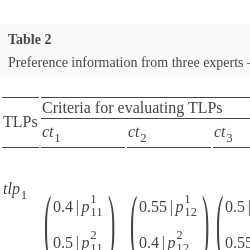 | $tl{p_{3}}$ | $\left(\begin{array}{l}0.55|{p_{31}^{1}}\\ {} 0.6|{p_{31}^{2}}\end{array}\right)$ | $-xx-$ | $\left(\begin{array}{l}0.5|{p_{33}^{1}}\\ {} 0.7|{p_{33}^{2}}\end{array}\right)$ | $\left(\begin{array}{l}0.55|{p_{34}^{1}}\\ {} 0.65|{p_{34}^{2}}\end{array}\right)$ | $\left(\begin{array}{l}0.6|{p_{35}^{1}}\\ {} 0.4|{p_{35}^{2}}\end{array}\right)$ | $\left(\begin{array}{l}0.5|{p_{36}^{1}}\\ {} 0.35|{p_{36}^{2}}\end{array}\right)$ | $\left(\begin{array}{l}0.75|{p_{17}^{1}}\\ {} 0.55|{p_{17}^{2}}\end{array}\right)$ |