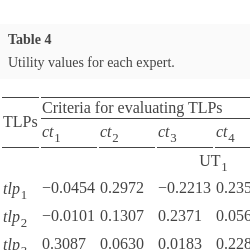 | $tl{p_{4}}$ | $\left(\begin{array}{l}0.6|{p_{41}^{1}}\\ {} 0.7|{p_{41}^{2}}\end{array}\right)$ | $\left(\begin{array}{l}0.65|{p_{42}^{1}}\\ {} 0.6|{p_{42}^{2}}\end{array}\right)$ | $\left(\begin{array}{l}0.45|{p_{43}^{2}}\\ {} 0.35|{p_{43}^{2}}\end{array}\right)$ | $\left(\begin{array}{l}0.65|{p_{44}^{1}}\\ {} 0.7|{p_{44}^{2}}\end{array}\right)$ | $\left(\begin{array}{l}0.45|{p_{51}^{1}}\\ {} 0.65|{p_{51}^{2}}\end{array}\right)$ | $\left(\begin{array}{l}0.6|{p_{51}^{1}}\\ {} 0.55|{p_{51}^{2}}\end{array}\right)$ | $-xx-$ |