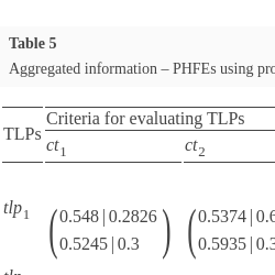 | $tl{p_{5}}$ | $\left(\begin{array}{l}0.7|{p_{51}^{1}}\\ {} 0.65|{p_{51}^{2}}\end{array}\right)$ | $\left(\begin{array}{l}0.5|{p_{52}^{1}}\\ {} 0.4|{p_{52}^{2}}\end{array}\right)$ | $\left(\begin{array}{l}0.6|{p_{53}^{1}}\\ {} 0.5|{p_{53}^{2}}\end{array}\right)$ | $\left(\begin{array}{l}0.6|{p_{54}^{1}}\\ {} 0.65|{p_{54}^{2}}\end{array}\right)$ | $\left(\begin{array}{l}0.6|{p_{51}^{1}}\\ {} 0.5|{p_{51}^{2}}\end{array}\right)$ | $\left(\begin{array}{l}0.7|{p_{51}^{1}}\\ {} 0.6|{p_{51}^{2}}\end{array}\right)$ | $-xx-$ |