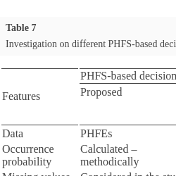 | Features | PHFS-based decision models | ||||||