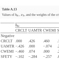 | 5 | Neutral (N) | .5 | $(.50,.50,1.00,.50,.50)$ | $(.50,.50,.00,.03,.50)$ | $(.50,.50,.35,.50,1.00)$ | $(.50,.50,.00,.50,.50)$ |