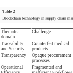 2 summarises the key challenges and opportunities related to blockchain implementation in healthcare supply chain management, as identified in the reviewed studies.
