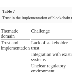 7 summarises key studies examining the central role of trust in the implementation of blockchain technologies within the healthcare sector. Trust emerges as a cross-cutting enabler, underpinning stakeholder engagement, regulatory compliance and the legitimacy of blockchain-based interventions.