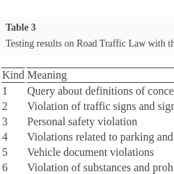 Testing results on Road Traffic Law with the proposed method.