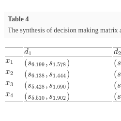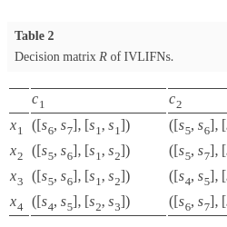 ${s_{{\alpha ^{-}}({\tilde{r}_{ij}})}},{s_{{\alpha ^{+}}({\tilde{r}_{ij}})}},{s_{{\beta ^{-}}({\tilde{r}_{ij}})}},{s_{{\beta ^{+}}({\tilde{r}_{ij}})}}\in {S_{[0,t]}}$. The decision matrix denoted by IVLIFNs is listed in Table