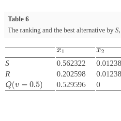 In the VIKOR method, the maximum group utility can be presented by min ${S_{i}}$ and minimum individual regret can be presented by $\min {R_{i}}$, where ${S_{i}}={L_{1,i}}$, and ${R_{i}}={L_{\infty ,i}}$.