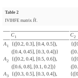 | ${A_{2}}$ | $\{([0.6,0.8],[0.1,0.2])\}$ | $\begin{array}[t]{l}\{([0.2,0.3],[0.4,0.5]),\\ {} ([0.4,0.5],[0.3,0.4])\}\end{array}$ | $\{([0.5,0.7],[0.1,0.3])\}$ | $\begin{array}[t]{l}\{([0.4,0.5],[0.2,0.4]),\\ {} ([0.6,0.7],[0.1,0.2])\}\end{array}$ |