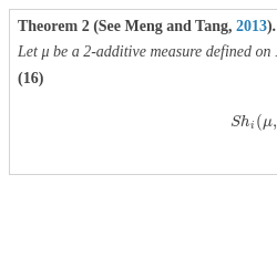 (iii) Let ${x_{i}}$ be an element in X. If we have $\mu (S\cup {x_{i}})=\mu (S)+\mu ({x_{i}})$ for all $S\subseteq X\setminus {x_{i}}$, then $S{h_{{x_{i}}}}(\mu ,X)=\mu ({x_{i}})$;