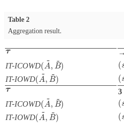 Compared with the previous distance measure, we can conclude that the IT-ICOWD measure is very useful to deal with deviated problem in aggregation on continuous valued interval 2-tuple linguistic information. The prominent characteristic of the IT-ICOWD measure is that it combines the GOWA operator with the distance measure and the IT-ICOWA operator in the same formula. The decision maker is able to consider the MAGDM problem more clearly according to his/her risk attitude in aggregation process because the parameter λ, which lies in the interval $[0,1]$, can be considered as the measure of the decision maker’s attitudinal character.